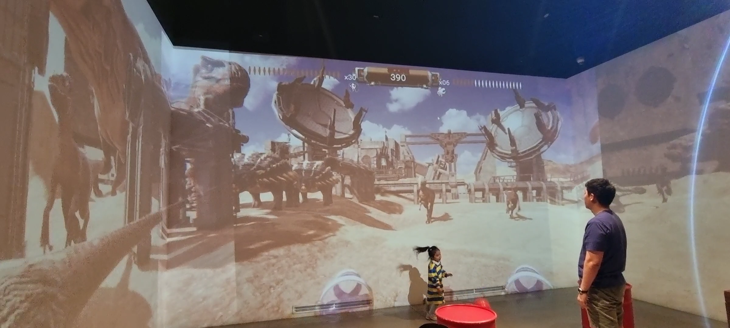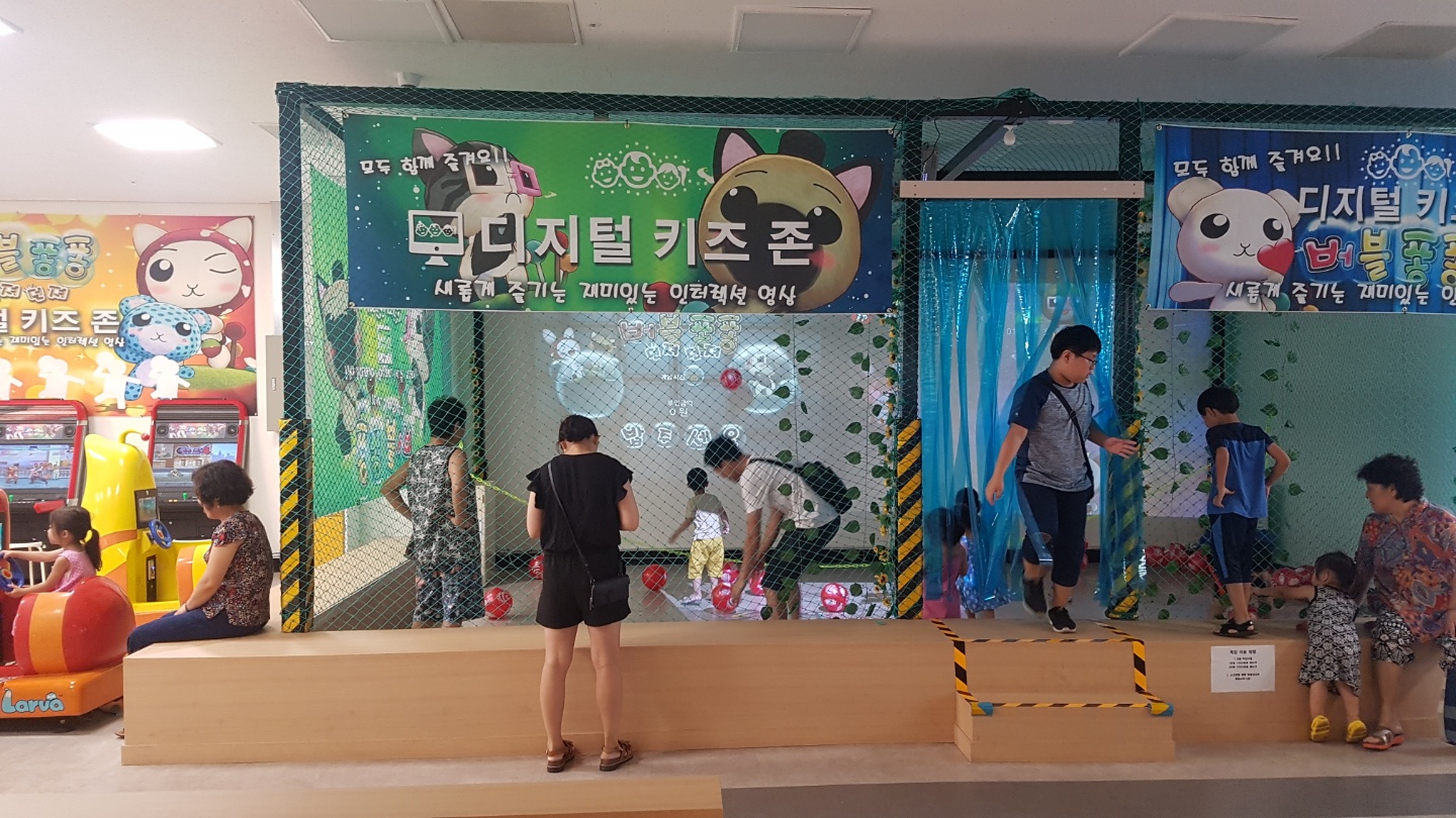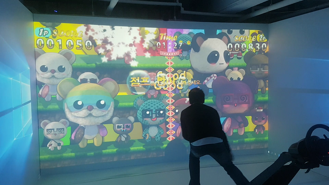 시흥 공룡월드에 대형스크린 3개를 활용하여 인터렉션을 통해 공을 던지면 공룡을 잡을수 있는 시스템 입니다. 총 5개의 스테이지로 구성 되어 있으며, 날아다니는 공룡과 바이크를 타고 도망 가는 다양한 스테이지로 구성 되어 있습니다.